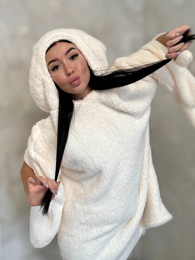 Ultra yumuşak peluş, büyük oversize kapüşon, tek beden çoğu kişiye uyar, nefes alan yapı, cozy sıcaklık.